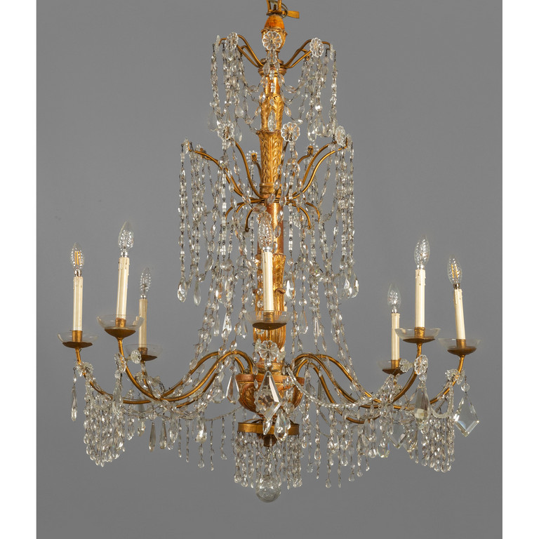 Lampadario Luigi XVI a otto luci fusto e bobeches in legno intagliato e dorato decorazione in cristallo Genova fine sec.XVIII
