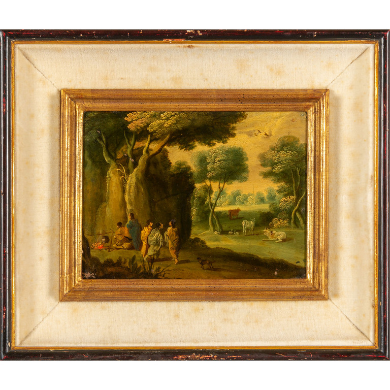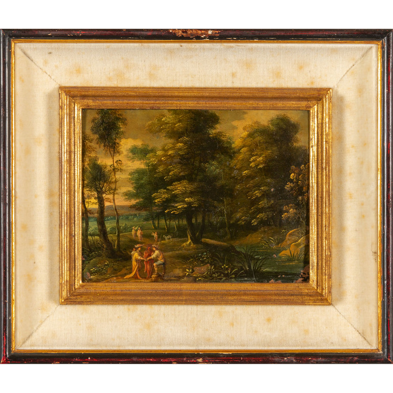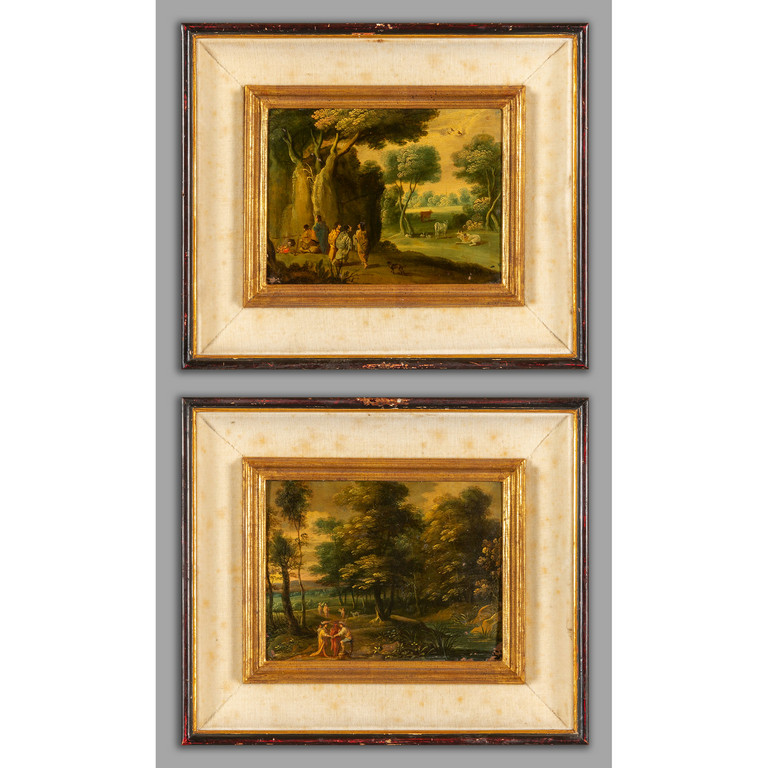 Scuola fiamminga sec.XVII 'Paesaggi animati' coppia di olii su rame