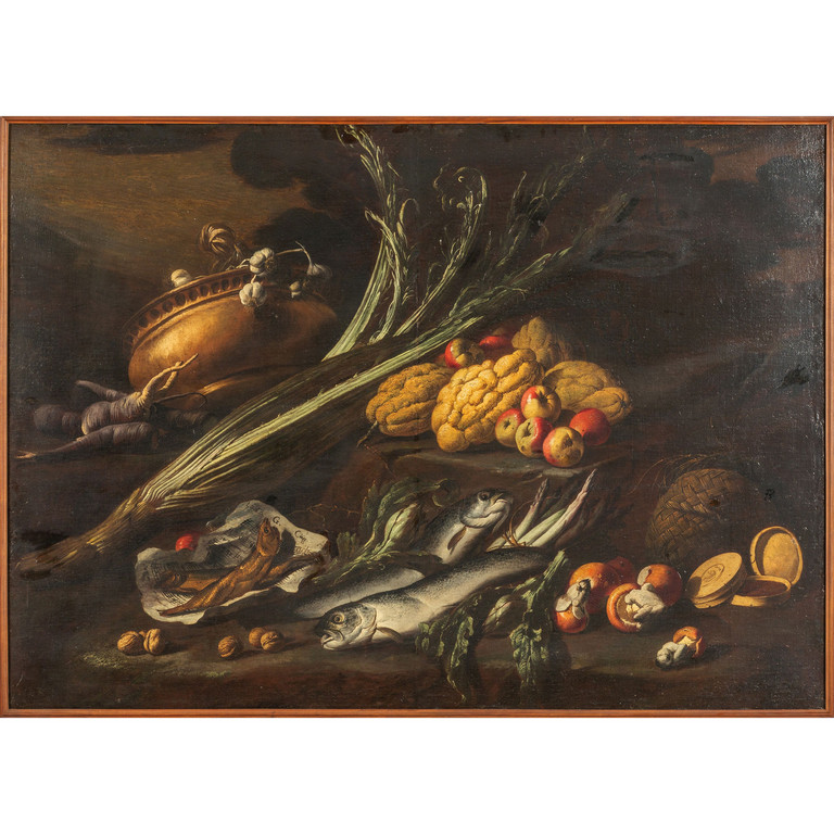 Scuola italiana sec.XVII 'Natura morta con cedri e frutti dell'autunno' olio f.to e d.to nello spartito 1668