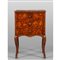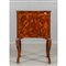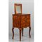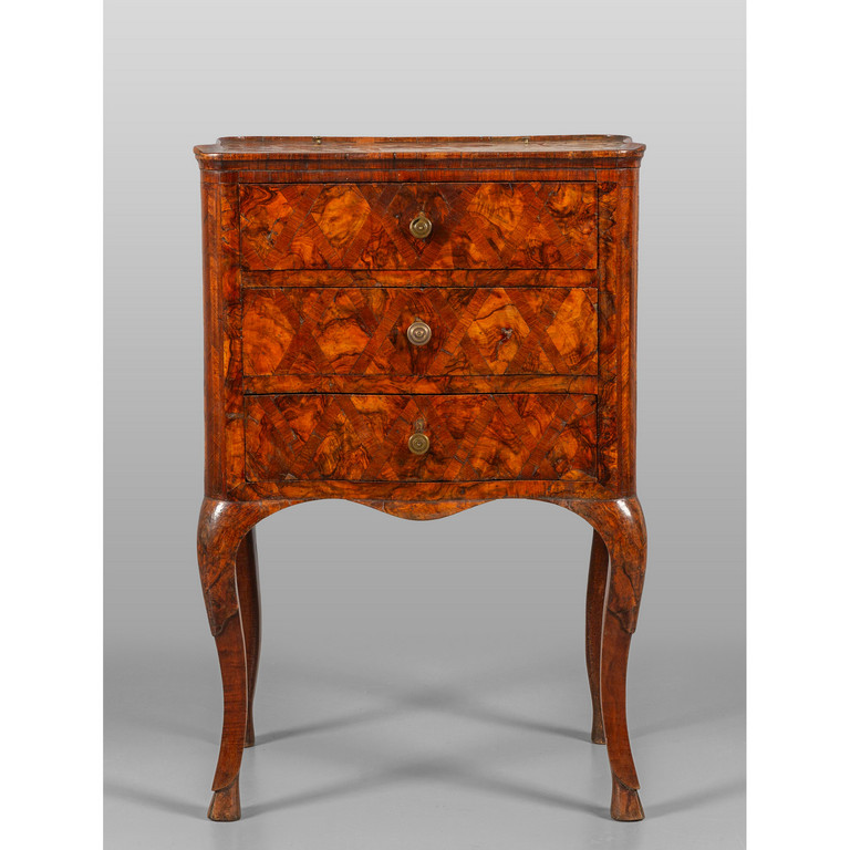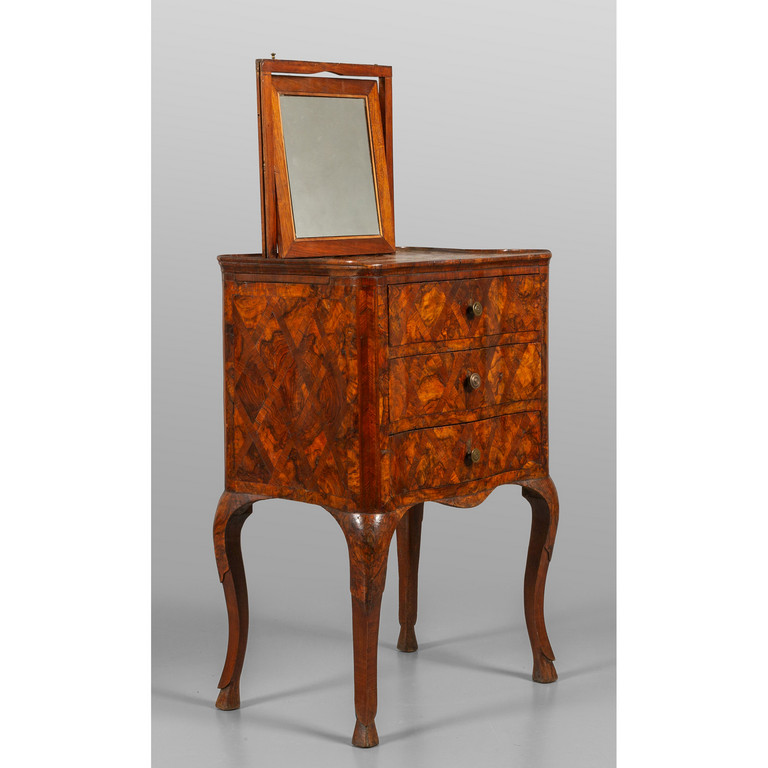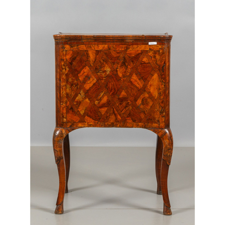 Comodino Luigi XIV da centro lastronato e marchettato in radica di noce e palissandro a grillage tre cassetti sul fronte pianetti laterali estraibili e specchiera a scomparsa Piemonte I metà sec.XVIII