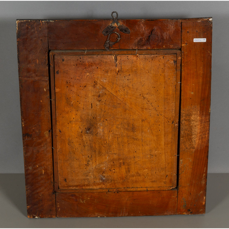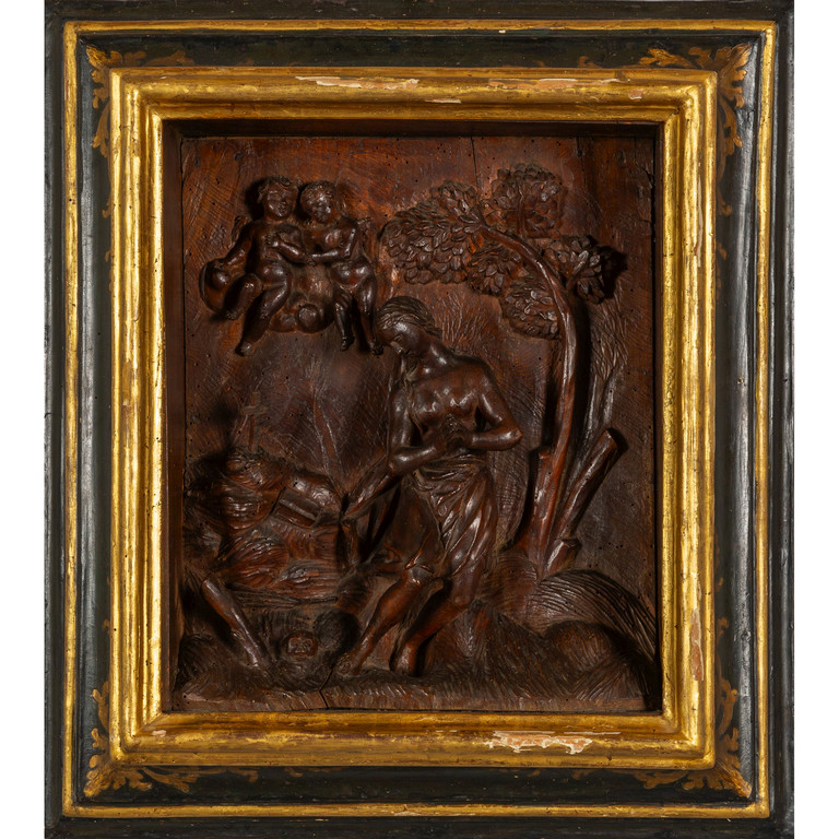 Maddalena in un paesaggio con angeli scultura in legno a patina scura cornice in legno laccato e dorato Venezia sec. XVI