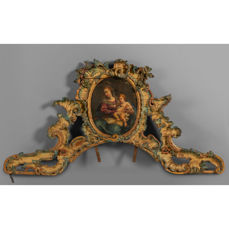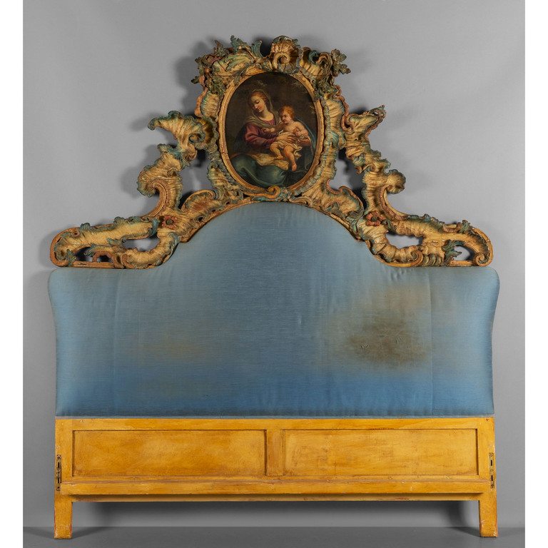 Testata da letto Luigi XV in legno intagliato e laccato in policromia al centro dipinto raffigurante Madonna con Bambino Genova sec.XVIII