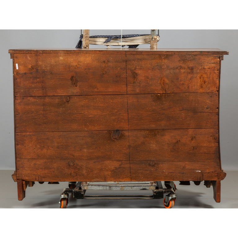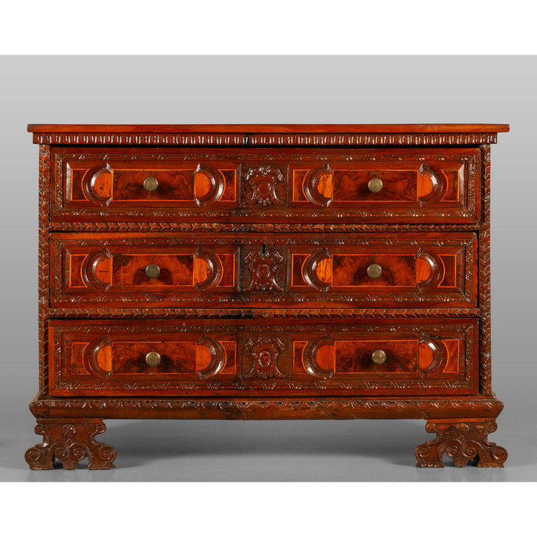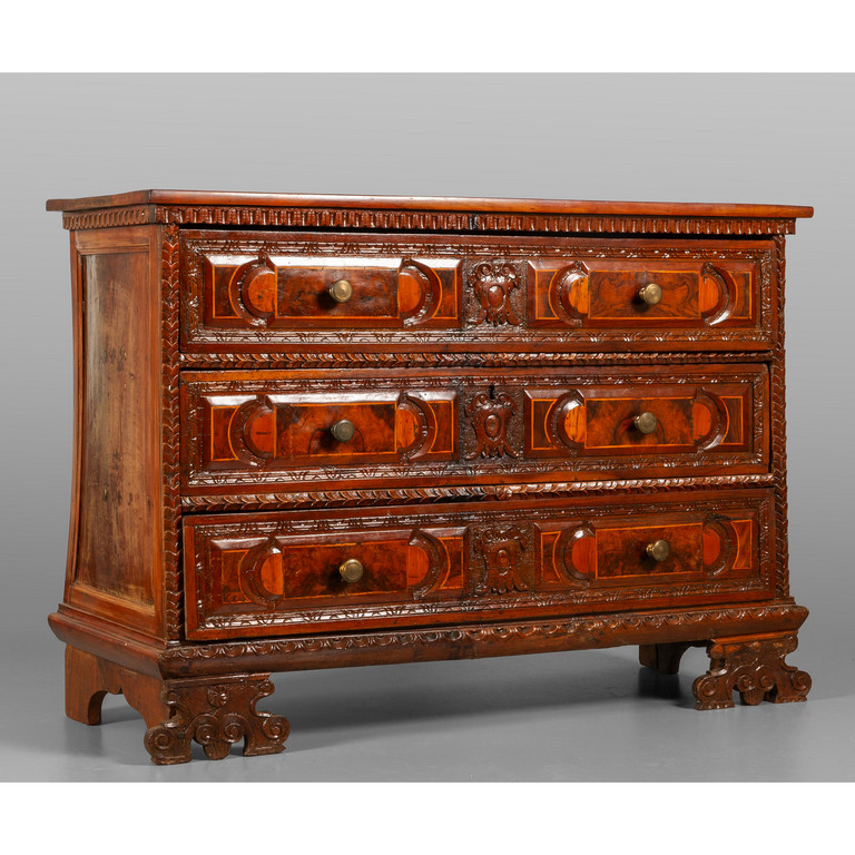 Canterano Luigi XIV in noce tre cassetti sul fronte intagliati e lastronati in radica piano con dentellatura Lombardia I metà sec.XVIII