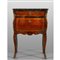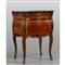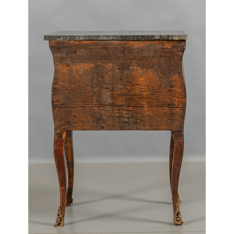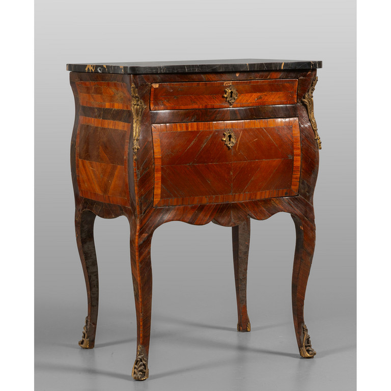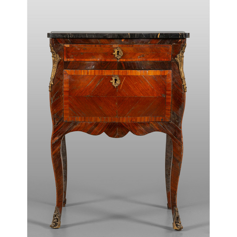 Comodino Luigi XV a gambe alte movimentato sul fronte e sui fianchi un cassetto piccolo e uno più grande lastronato in palissandro e legno di rosa con applicazioni in bronzo dorato piano in marmo Roma I metà sec.XVIII