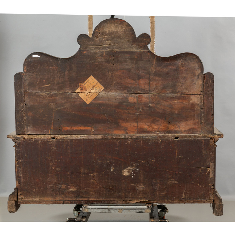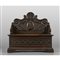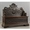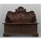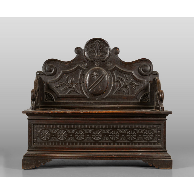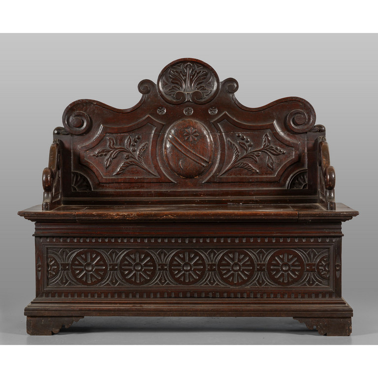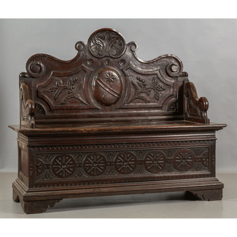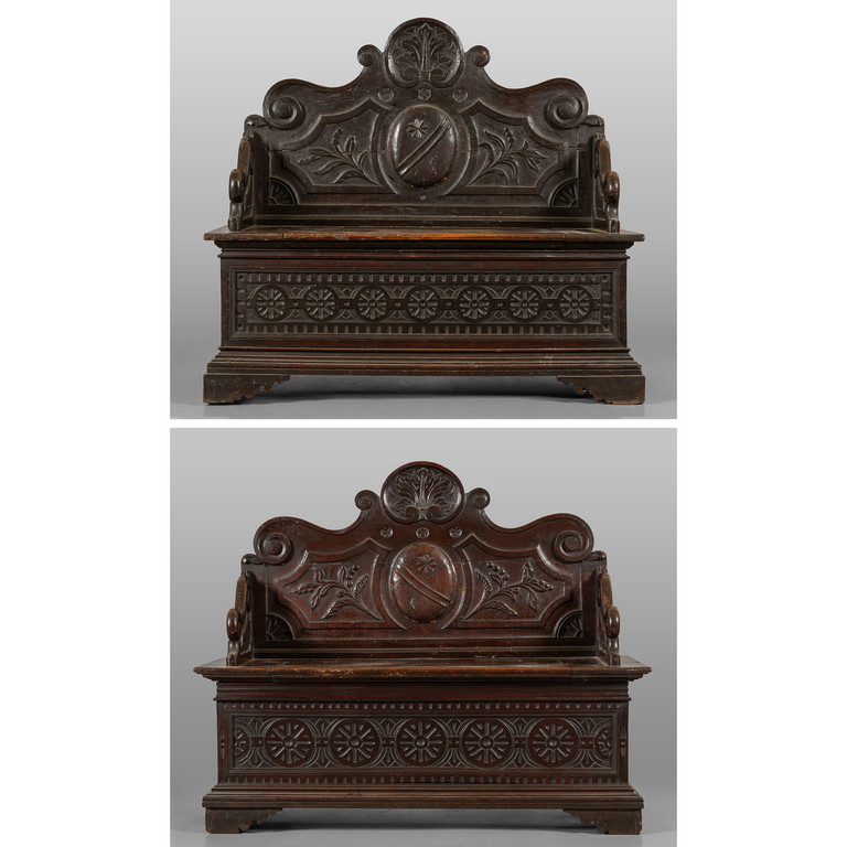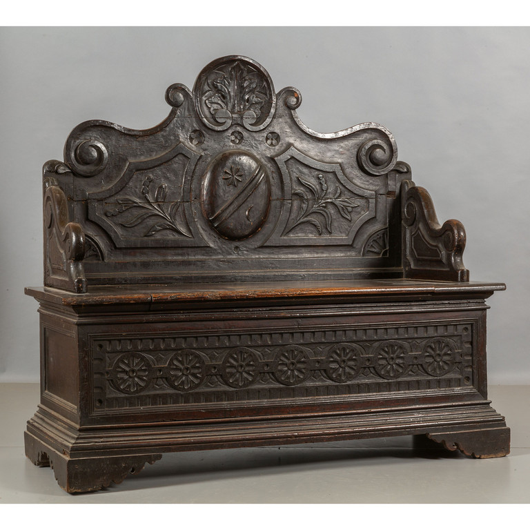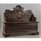 Coppia di panche Luigi XIV in noce parte inferiore a cassapanca con frontale scolpito schienale con braccioli intagliato al centro con stemma nobiliare Lombardia fine sec.XVII