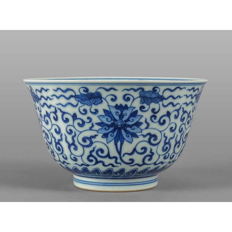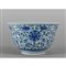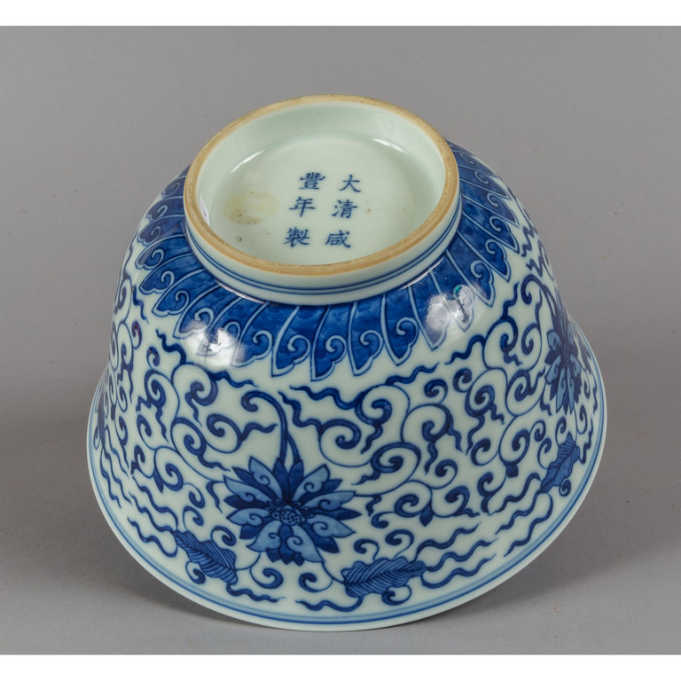 Grande ciotola in porcellana a decoro bianco e blu con fiori di loto marcata alla base Cina sec.XIX