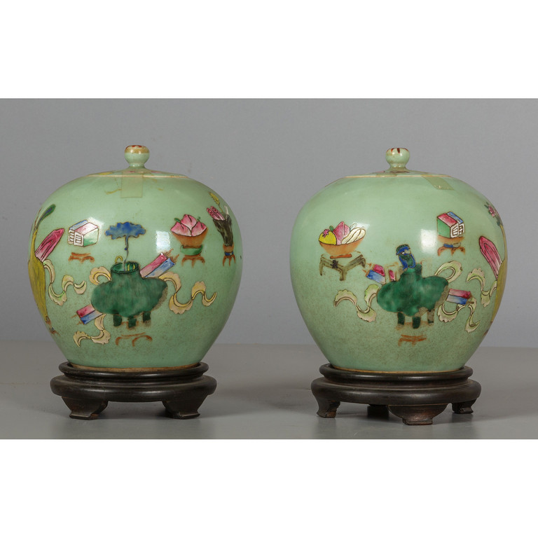 Coppia di vasi Celadon con coperchio decorato in policromia