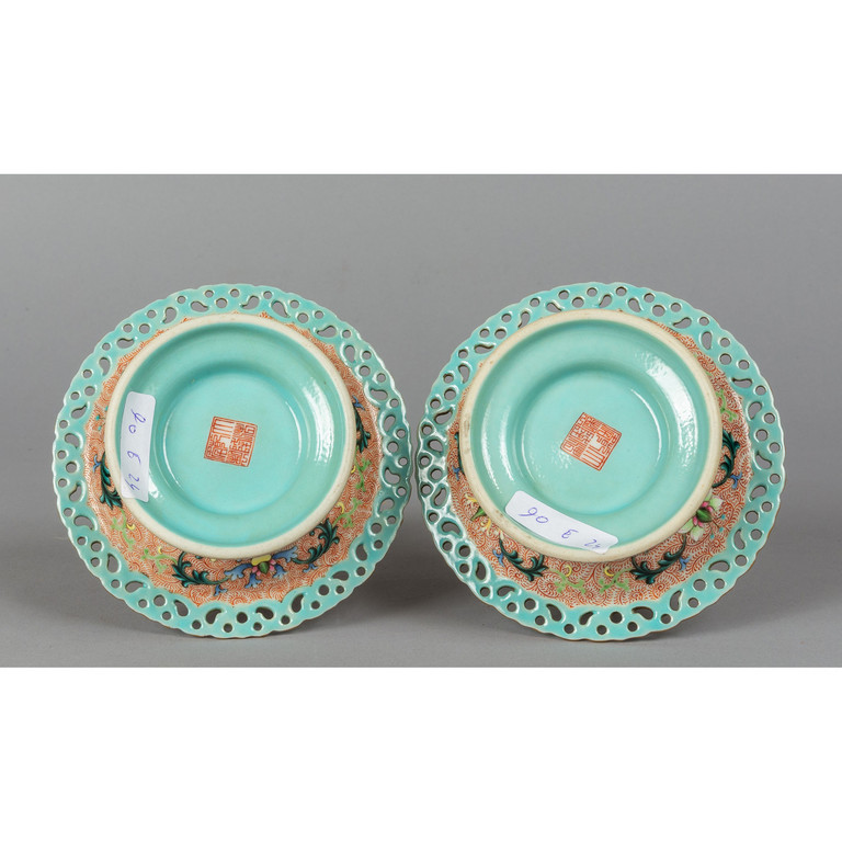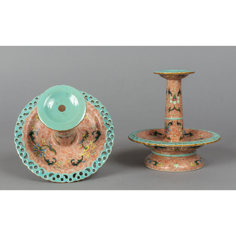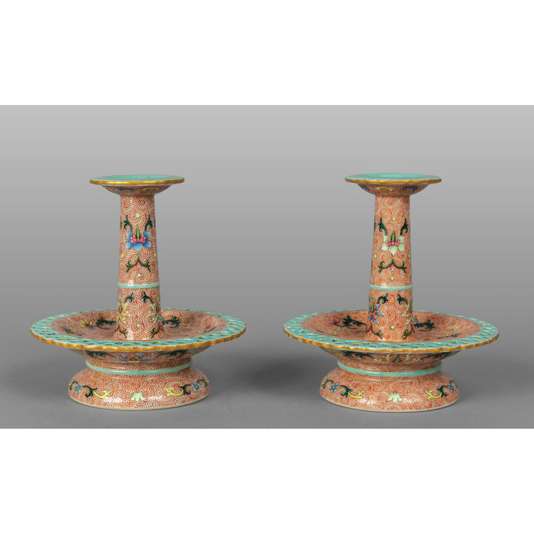 Rara coppia di candelieri in porcellana policroma marcati alla base Cina sec.XVIII