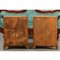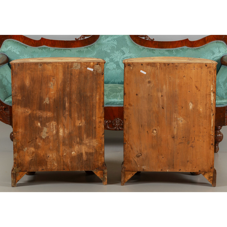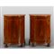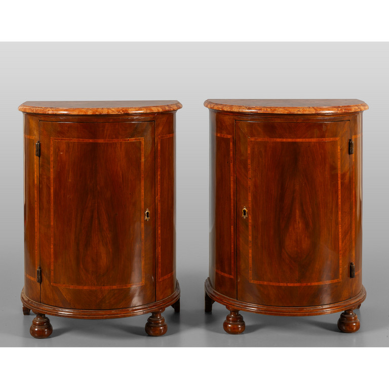 Coppia di comodini a mezza luna ad un'anta lastronati e filettati piano in marmo