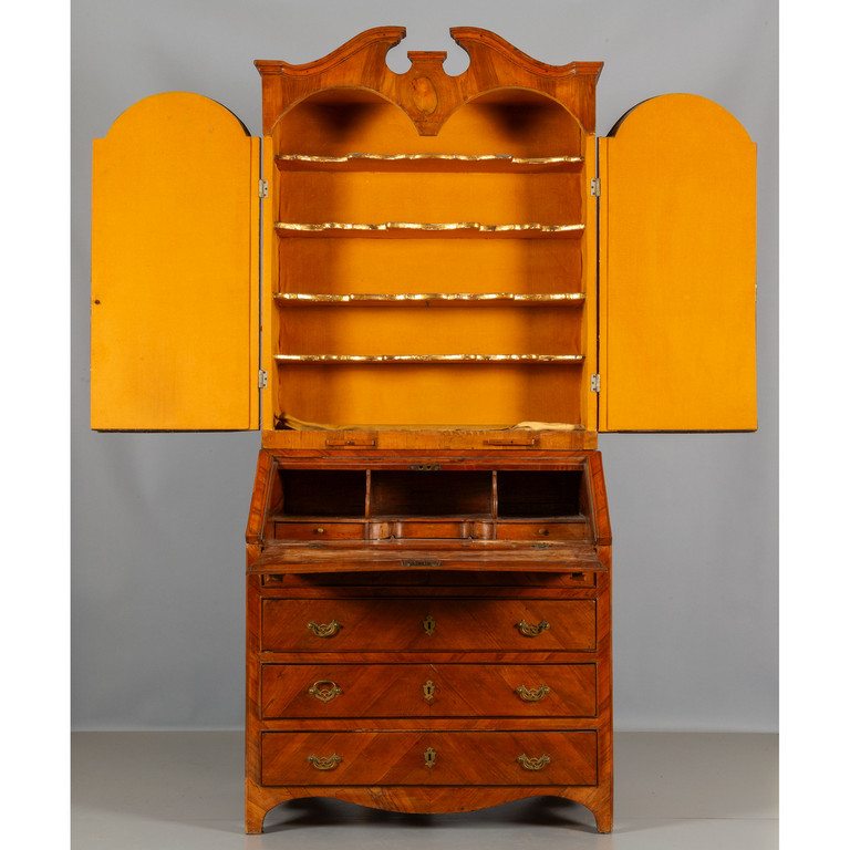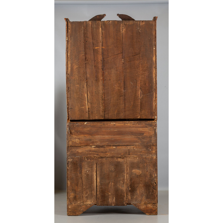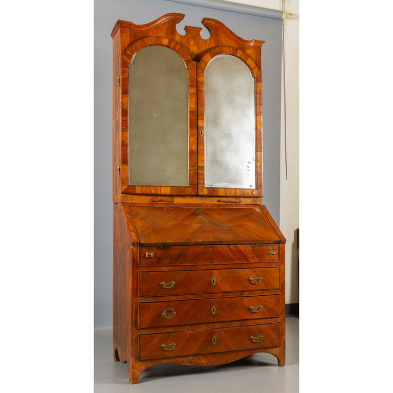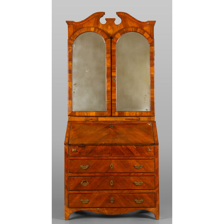 Doppio corpo lastronato in noce parte inferiore a tre cassetti parte superiore a due ante con specchi Lombardia sec.XIX