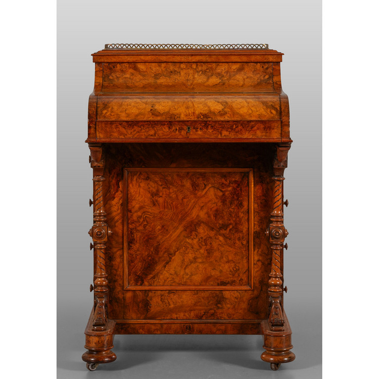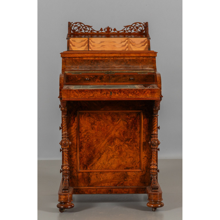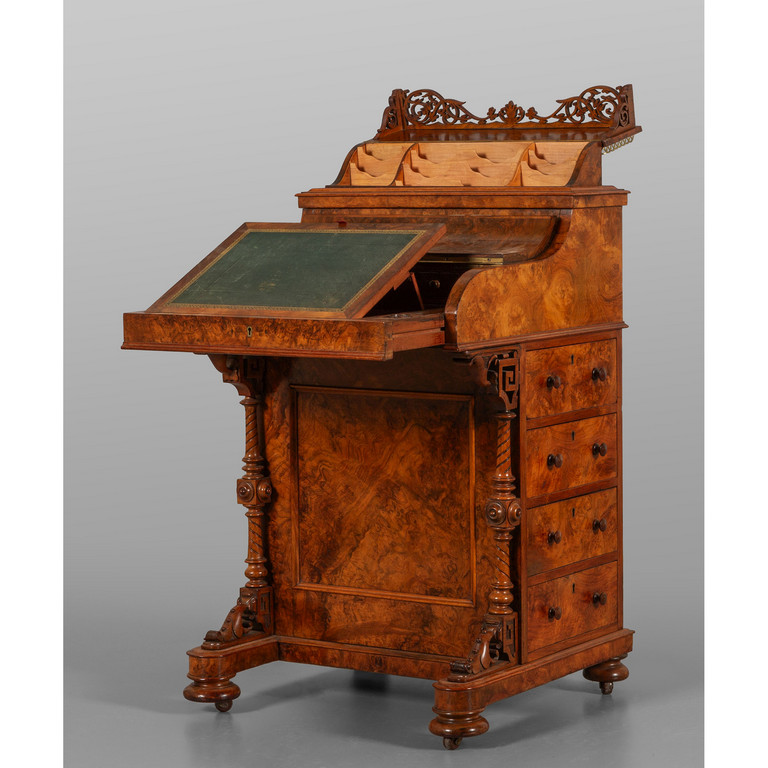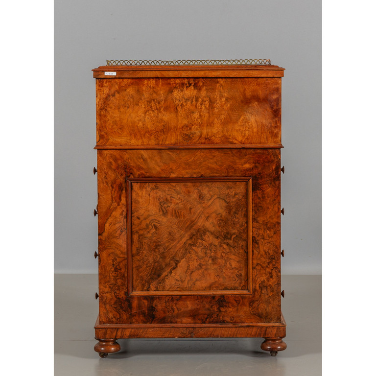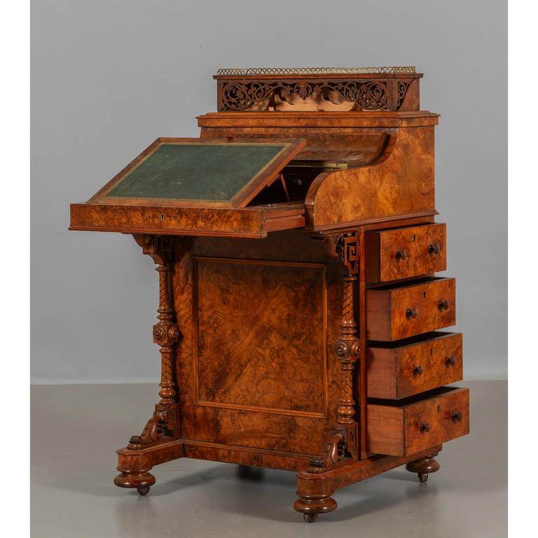Scrittoio apribile con quattro cassetti laterali lastronato in radica di noce meccanismo automatico per apertura del cartonier Inghilterra sec.XIX