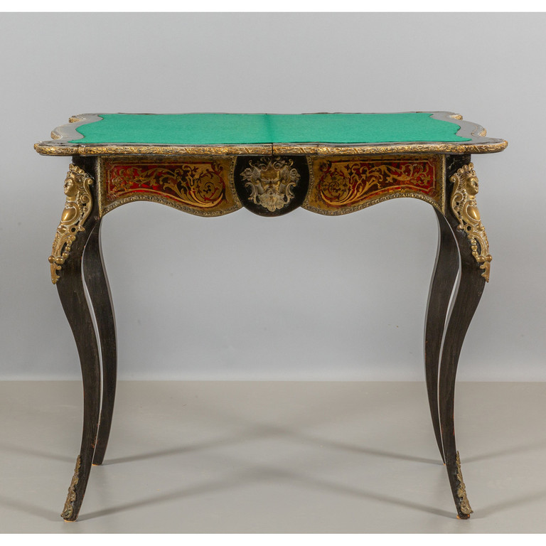 Tavolino da gioco in stile Boulle riccamente lastronato in tartaruga con intarsi in ottone decorazioni in bronzo Francia sec.XIX