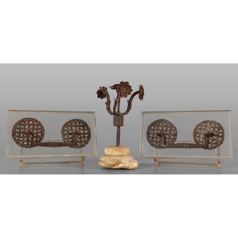 Due antiche maniglie gotiche in ferro e antico fiore in ferro battuto montato su capitello in marmo