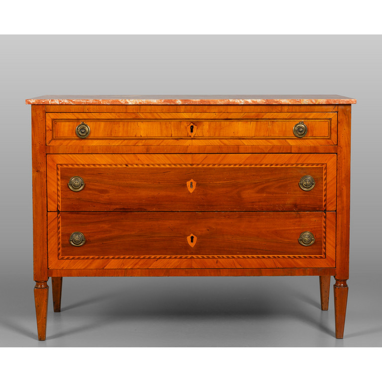 Comò Direttorio lastronato in ulivo e legni vari due cassetti grandi ed uno piccolo sul fronte piano in marmo Genova inizi sec.XIX