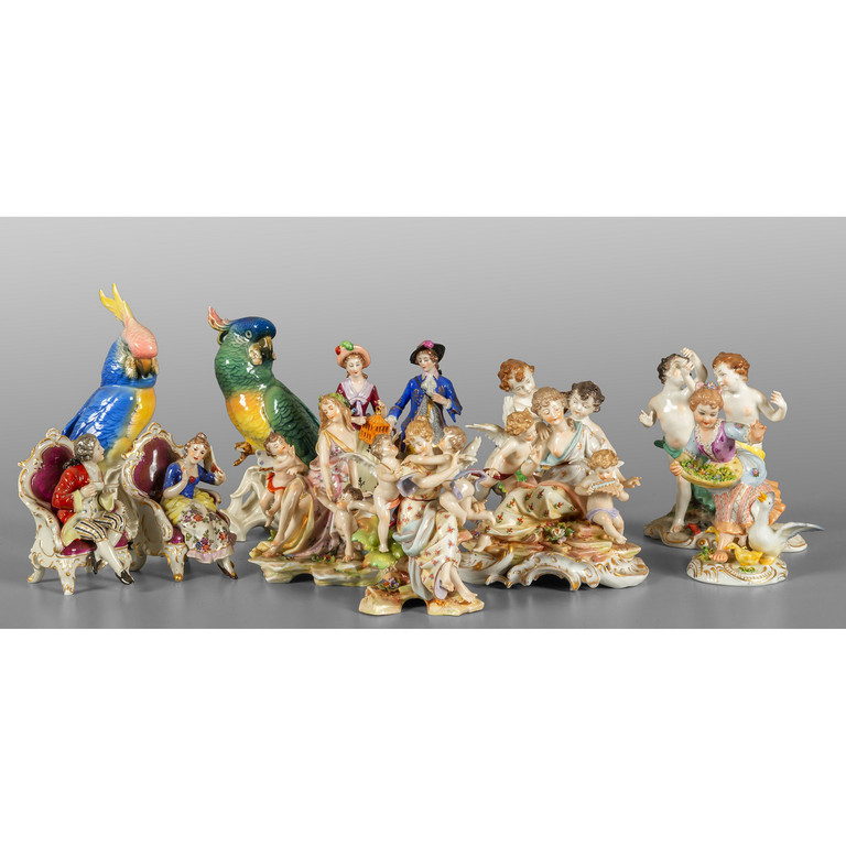 Dodici gruppi in porcellana policroma di varie manifatture