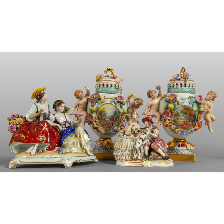Coppia di vasi in porcellana policroma e due gruppi in porcellana policroma