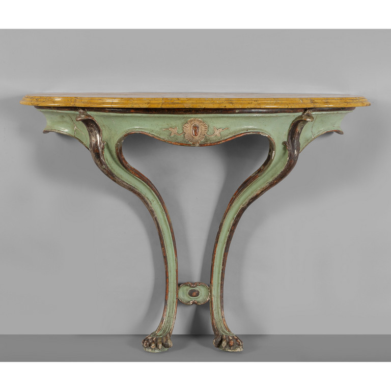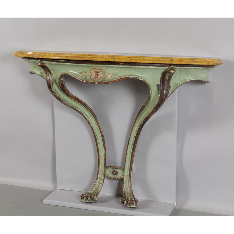 Console Luigi XIV in legno intagliato dorato e laccato piano in breccia gialla Italia Centrale sec.XVIII