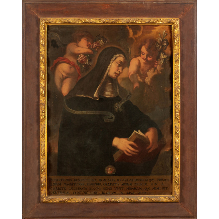 Scuola cremonese sec.XVII 'Santa Gertrude monaca benedettina tra gli Angeli' olio cornice coeva a cassetta in legno naturale e dorato