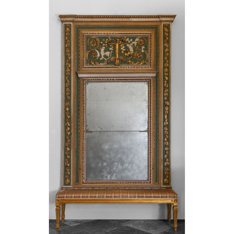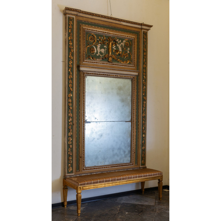 Specchiera fondosala Luigi XVI in legno finemente intagliato laccato e dorato sec.XVIII poggiante su panca dorata in stile