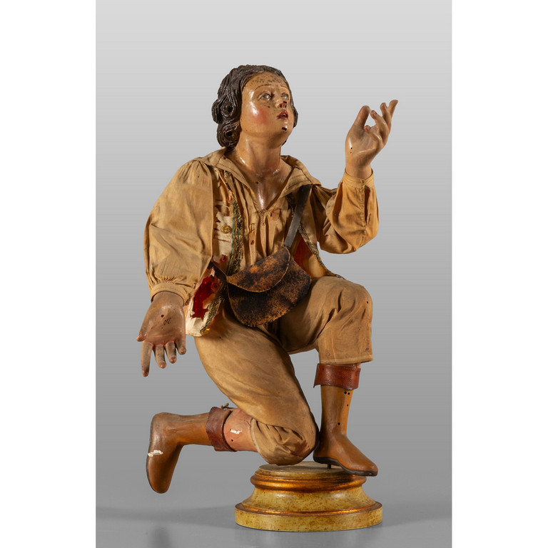 Pastorello genuflesso scultura in legno laccato con abiti di epoca in stoffa Napoli sec.XVIII