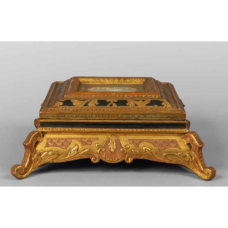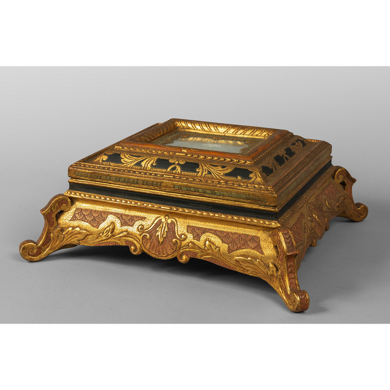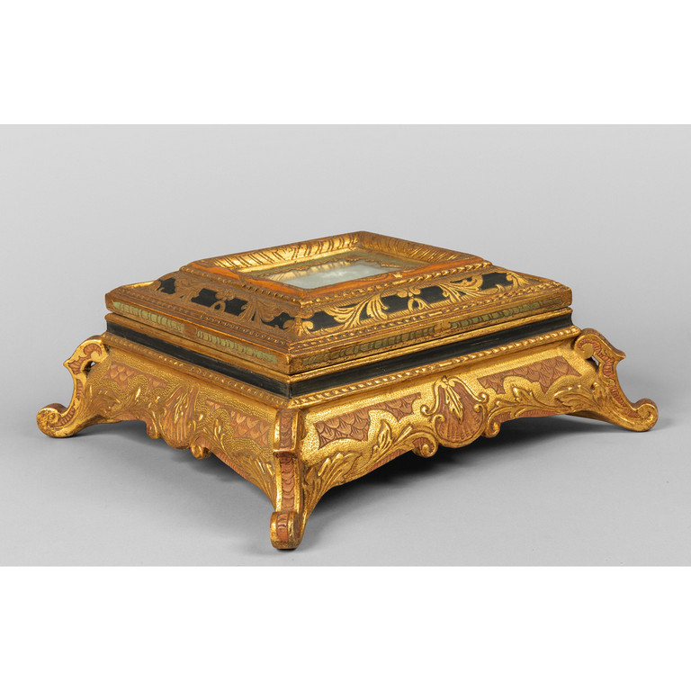 Cofano portagioie in legno intagliato e dorato a più colori sec.XX