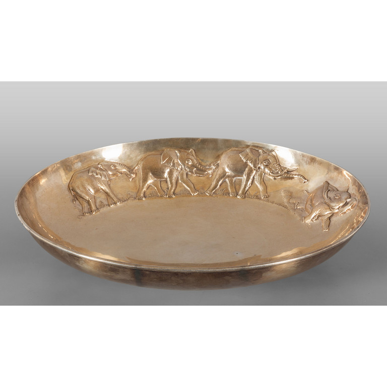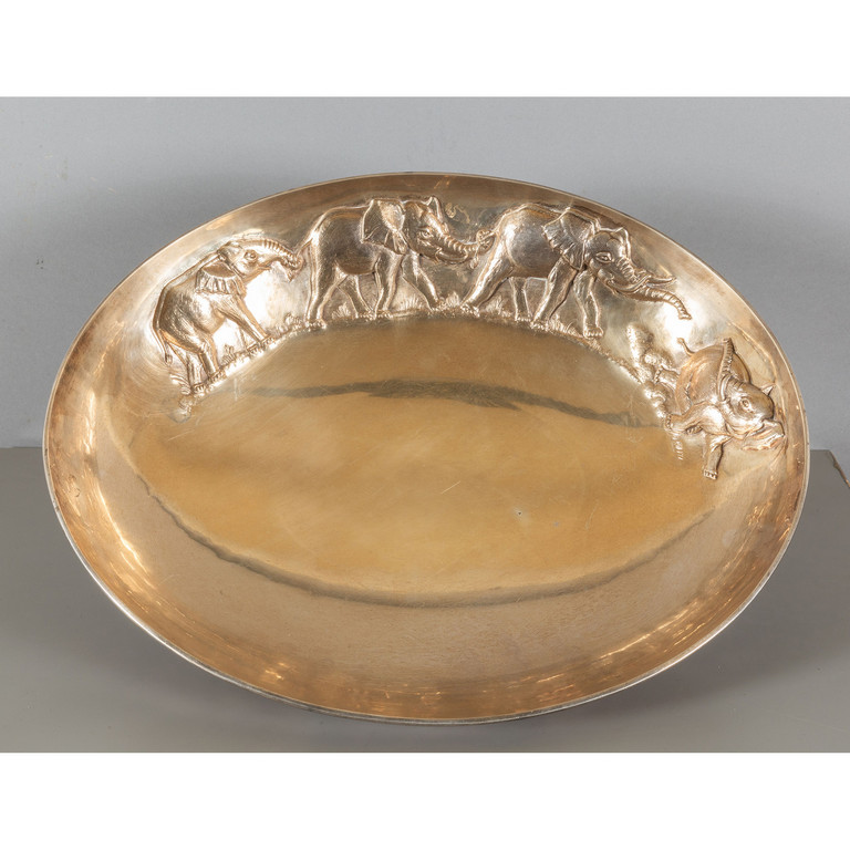 Grande centrotavola in argento con bordo sbalzato con figure fratelli Cacchione Milano argentieri