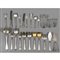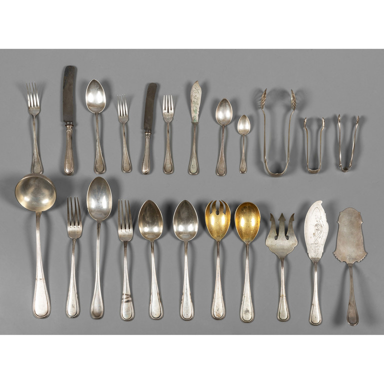 Servizio di posate in argento per 12 composto da: 12 forchette grandi 12 piccole 12 forchette pesce e 12 coltelli 12 coltelli grandi e 12 piccoli 12 cucchiai grandi 12 da dolce e 12 da gelato 1 mestolo 1 cucchiaione 3 coppie di posate da portata 1 paletta 3 pinze