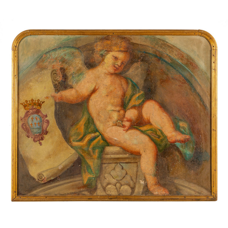 'Putto che regge uno stemma' strappo di affresco riportato su tela sec.XVIII