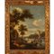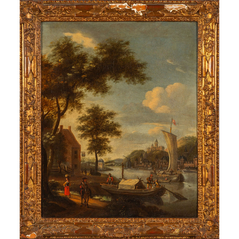 Scuola fiamminga inizi sec.XVIII 'Veduta fluviale con porto e personaggi' olio