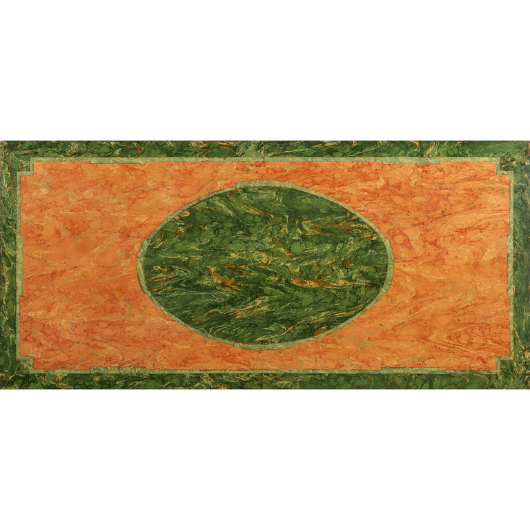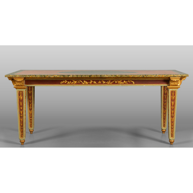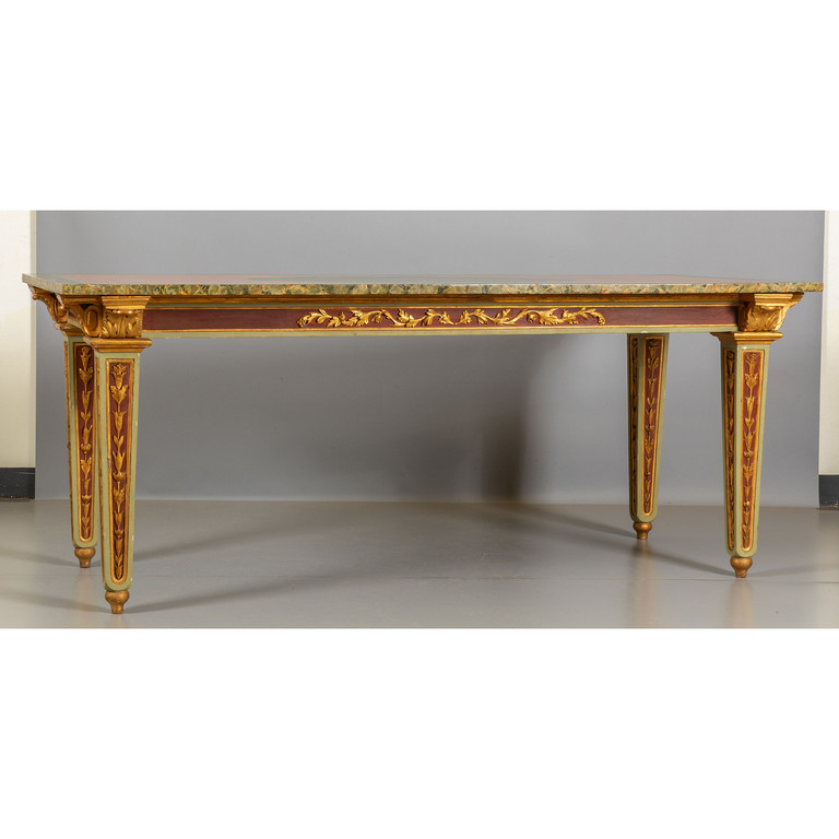 Tavolo da pranzo in stile Luigi XVI in legno intagliato laccato in policromia e dorato piano a finto marmo sec.XX