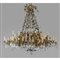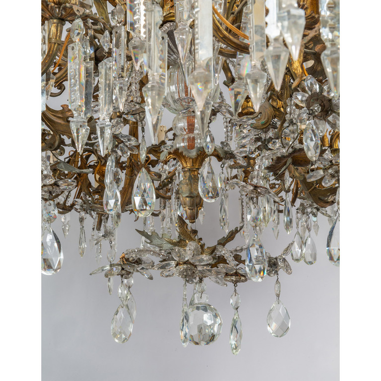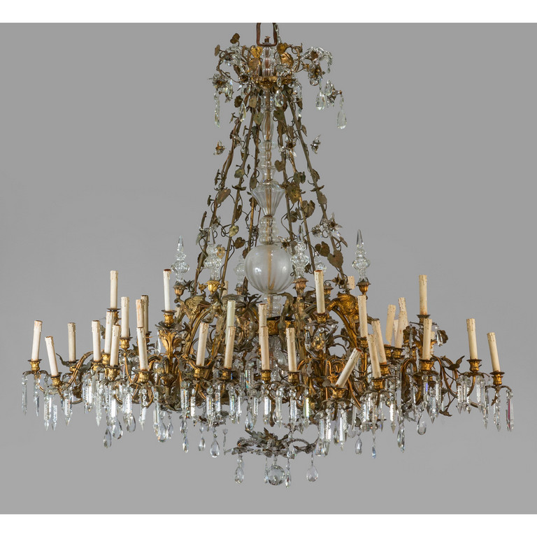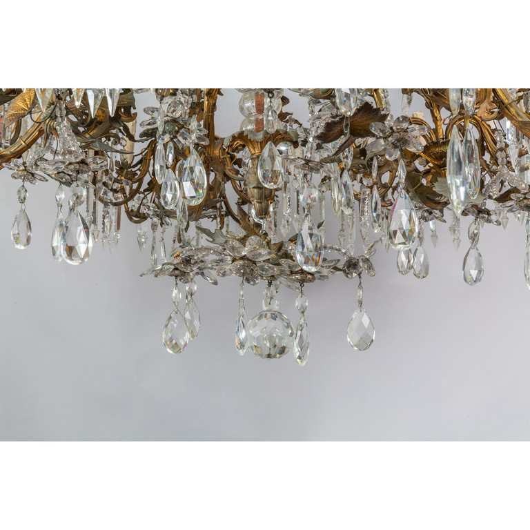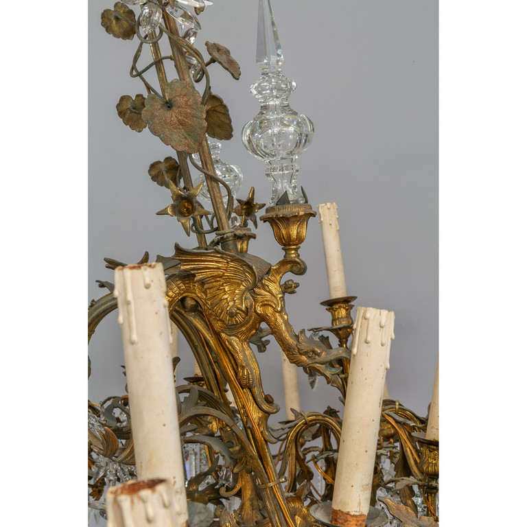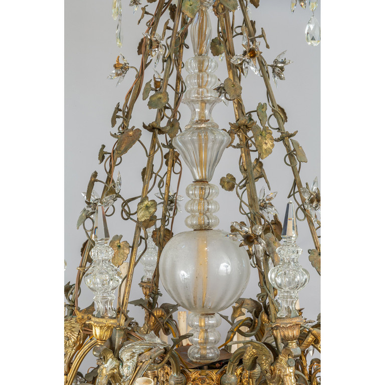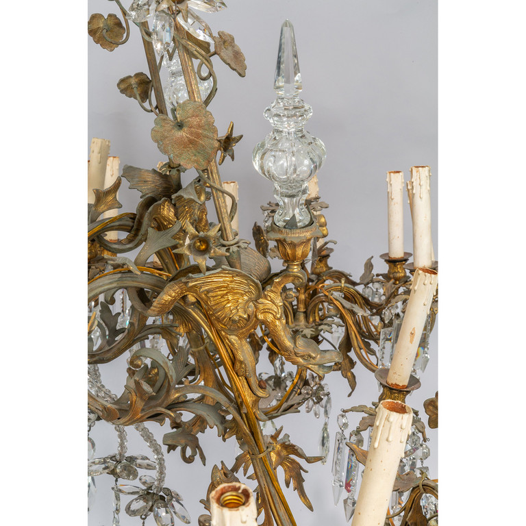 Grande lampadario in bronzo e antimonio dorato a 36 luci fusto centrale con vetro bracci sormontati da draghi alati ricca applicazione di cristalli molati metà sec.XIX