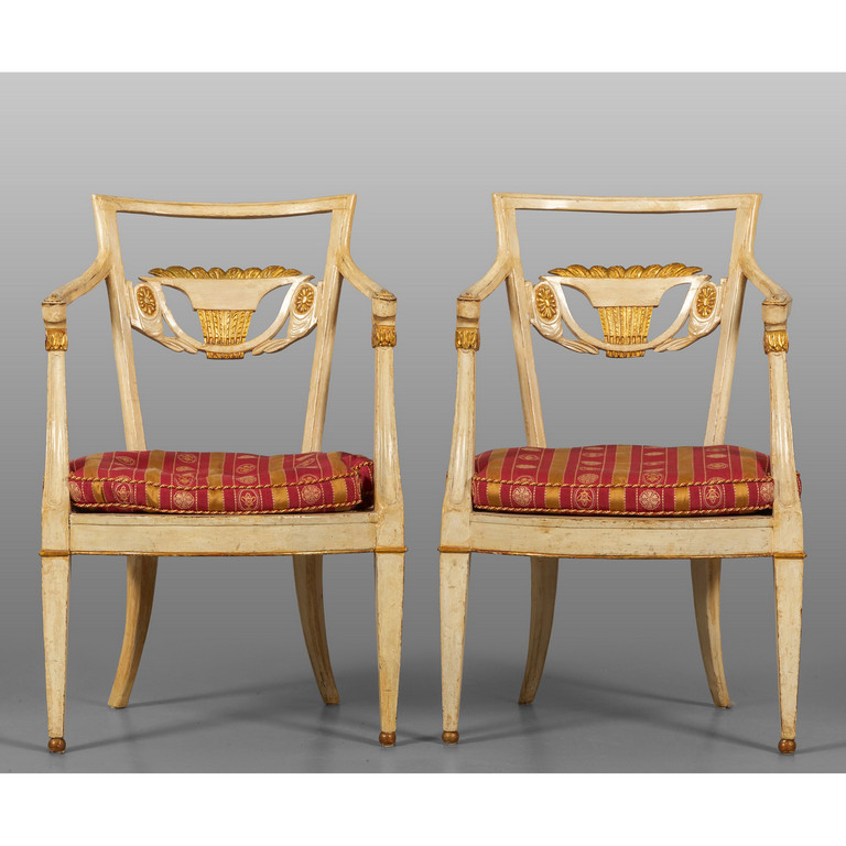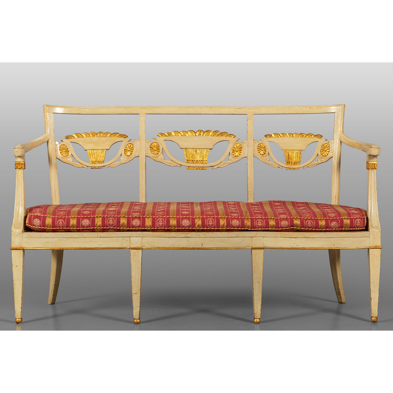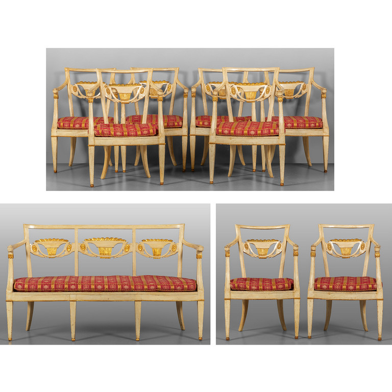 Salotto Carlo X in legno laccato e dorato con schienale a scudo con intagli composto da sei poltrone ed un divano a tre posti Genova inizi sec.XIX