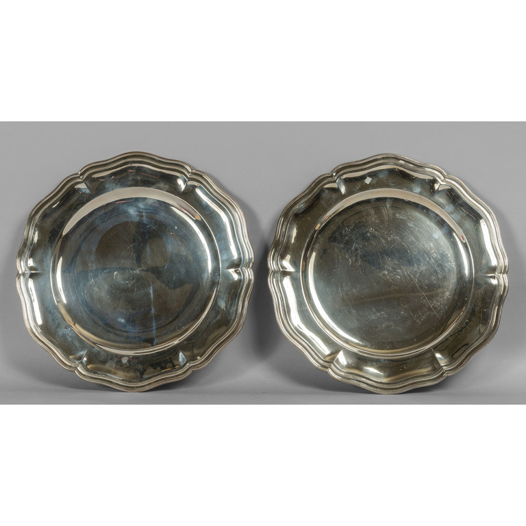 Coppia di piatti da portata in argento sbalzato in stile barocco