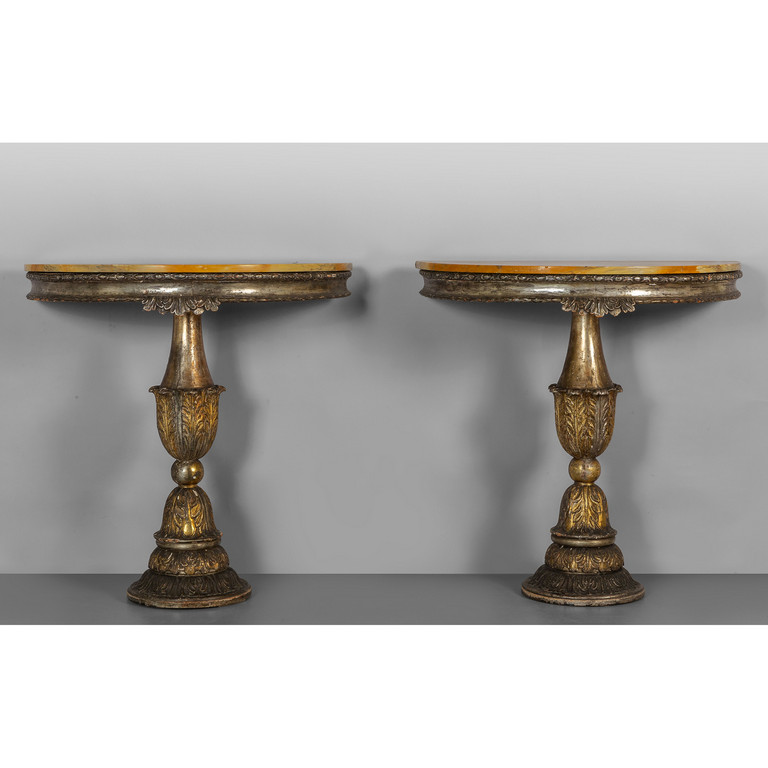 Coppia di consoles Luigi XVI a mezzaluna in legno intagliato e dorato a mecca piano in breccia gialla Italia Centrale sec.XVIII