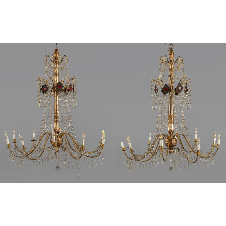 Coppia di lampadari a dieci luci fusto in legno intagliato e dorato ricca decorazione in cristallo con placchette in rame Genova inizi sec. XX