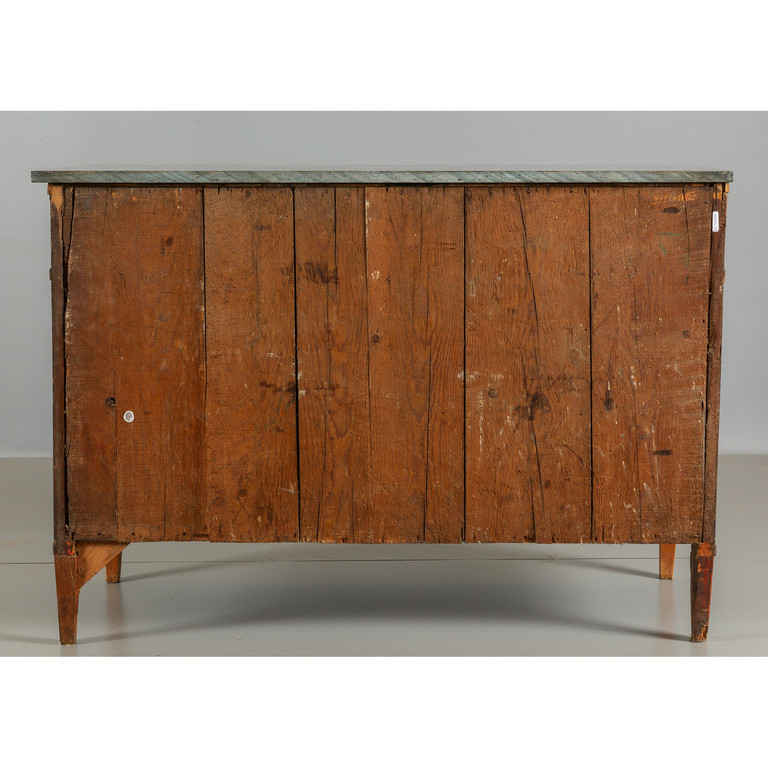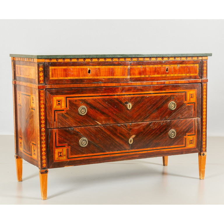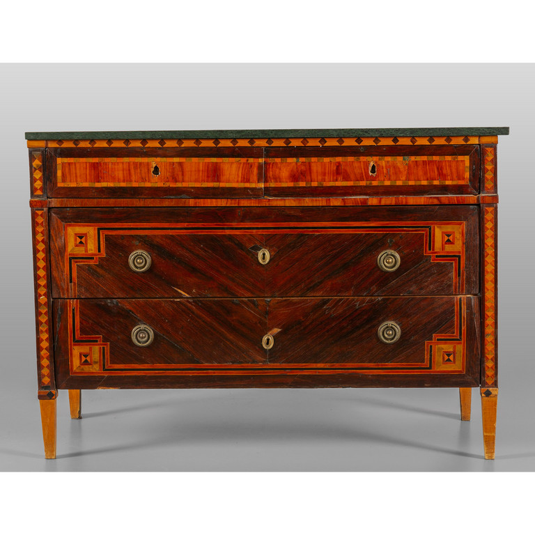 Comò Luigi XVI lastronato in palissandro e riccamente intarsiato a motivi geometrici in legni vari sul fronte due cassetti grandi e due mezzi cassetti gambe coeve in massello piano in marmo Genova II metà sec.XVIII
