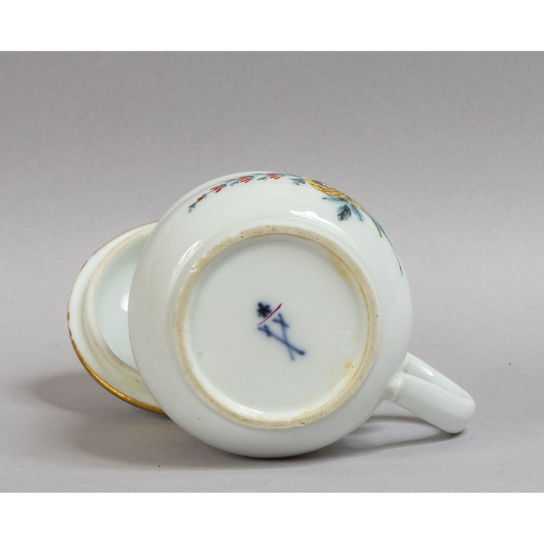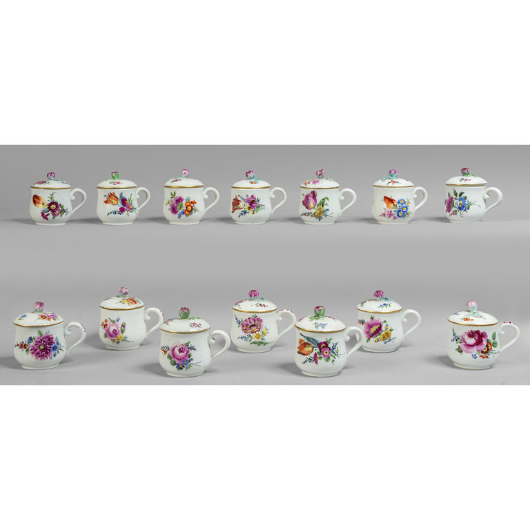 Sette più sette cremierine in porcellana di Meissen decorate in policromia a fiori su fondo bianco sec.XIX
