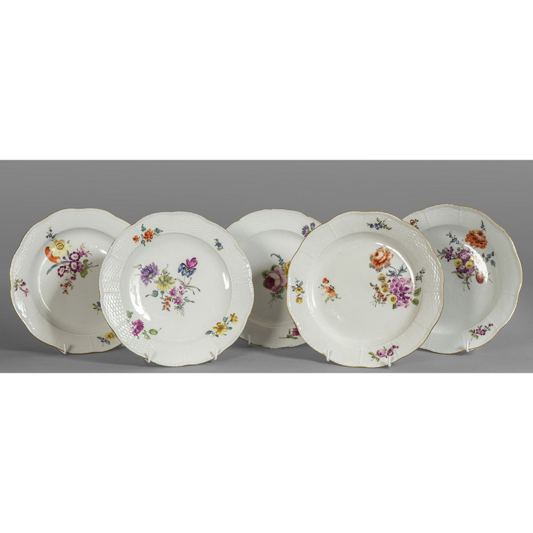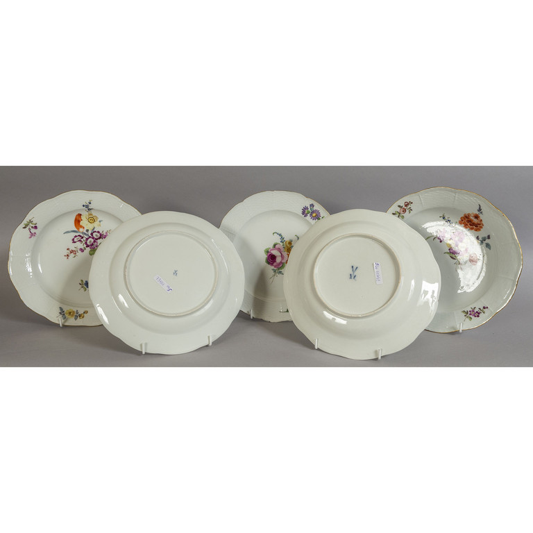 Cinque piatti in porcellana di Meissen decorati in policromia a fiori