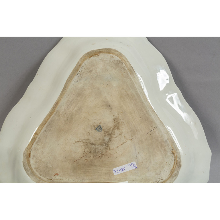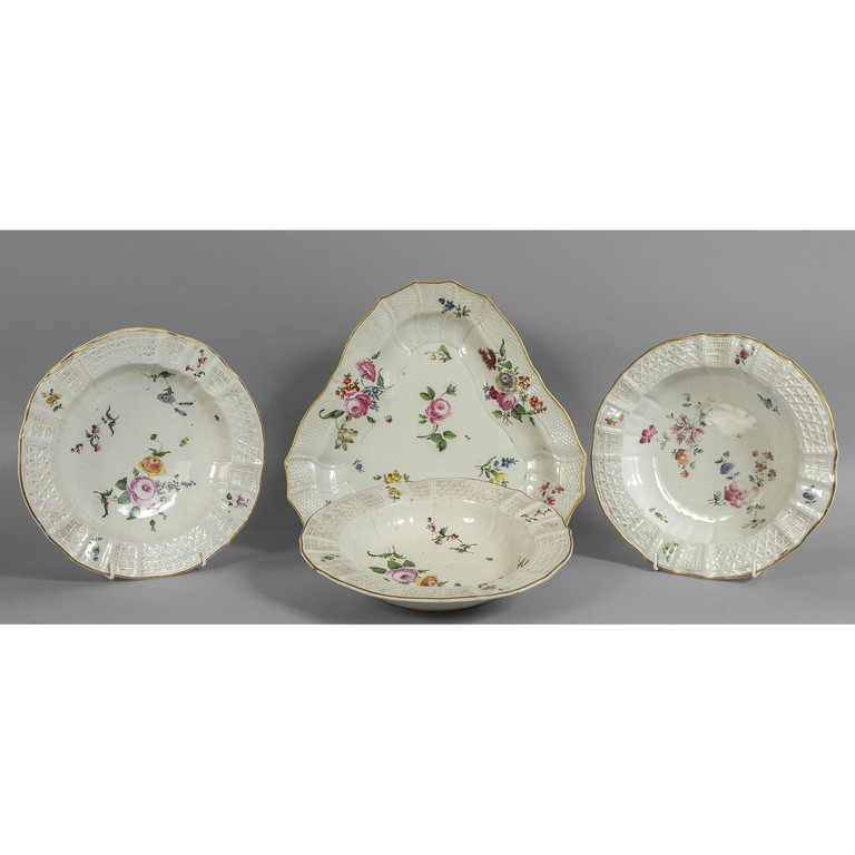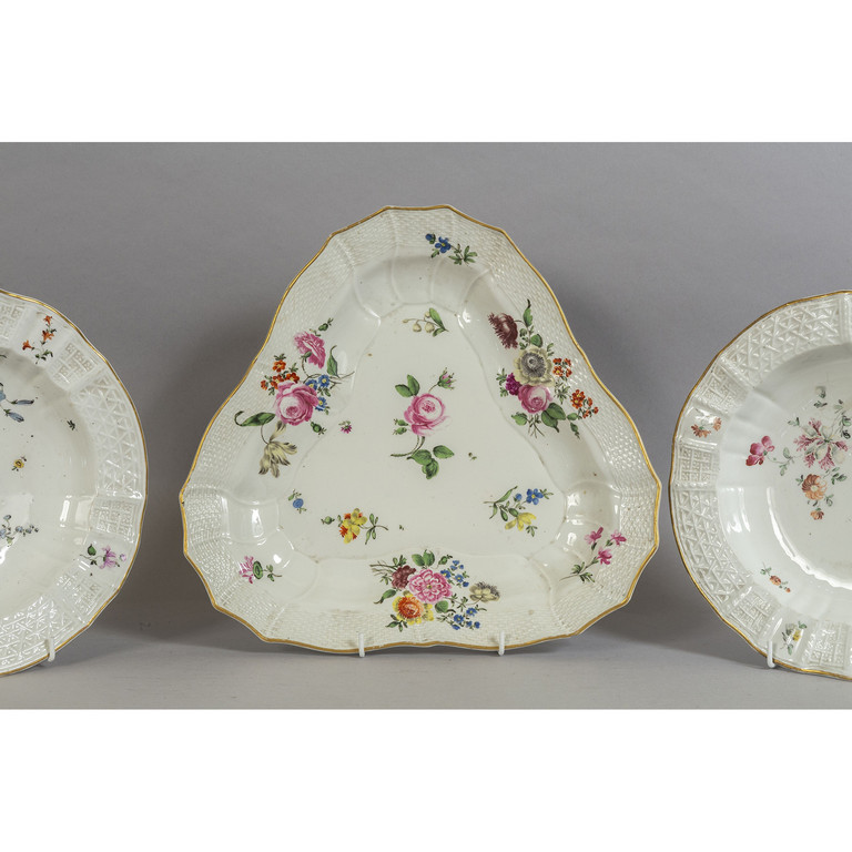 Tre piatti fondi ed un vassoio triangolare in porcellana bianca decorati in policromia Vienna sec.XIX