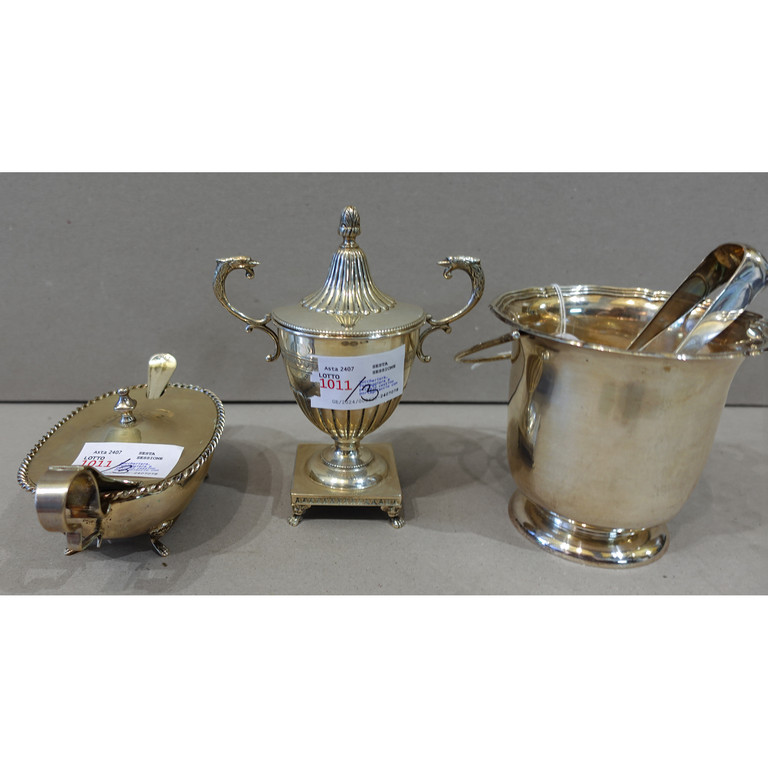 Zuccheriera formaggiera e piccolo cestino portaghiaccio con pinzette in argento