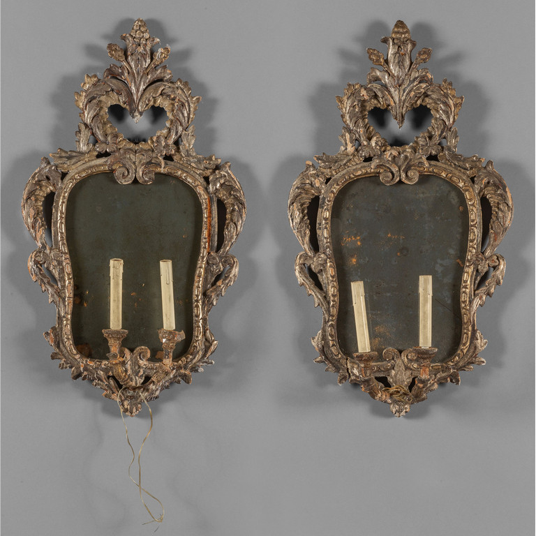 Coppia di grandi apliques Luigi XV in legno intagliato ed argentato luci coeve Italia Meridionale sec.XVIII