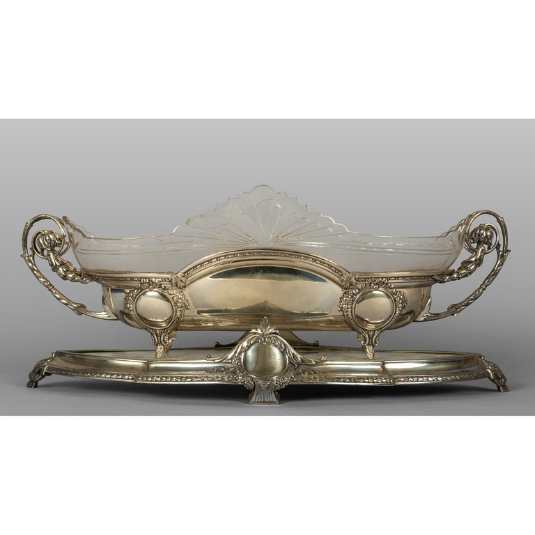 Coppa centrotavola Liberty in metallo argentato e cristallo base in specchio inizi sec.XX