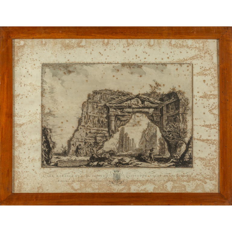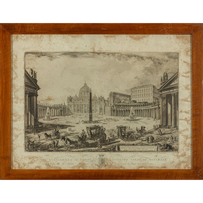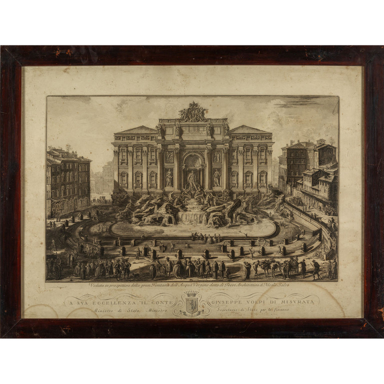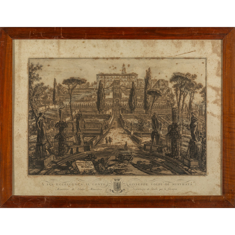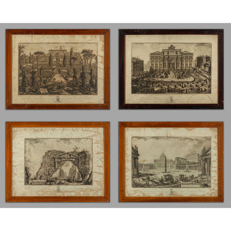 'Veduta della fontana di trevi' 'Veduta della Villa Estense a Tivoli' 'Veduta di Piazza San Pietro' e 'Veduta di un portico della villa di Domiziano' quattro stampe da Piranesi eseguite dalla regia calcografica ed offerte a sua ecellenza il Conte Giuseppe Volpi di Misurata I metà sec.XX