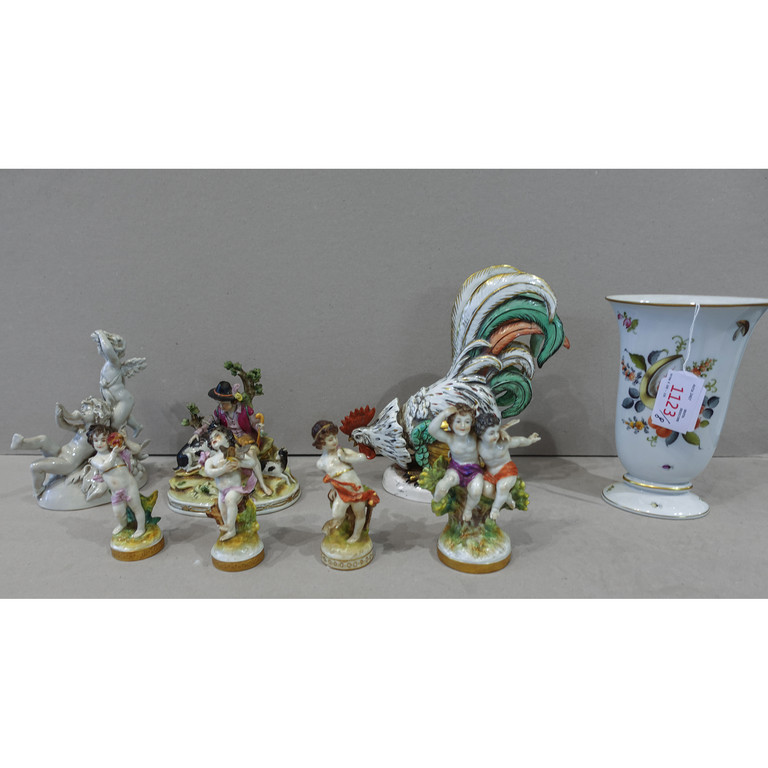 Tre puttini in porcellana un gruppetto con due angioletti gruppo raffigurante pastorella con cane vaso Herend gallo in porcellana e due putti in porcellana bianca