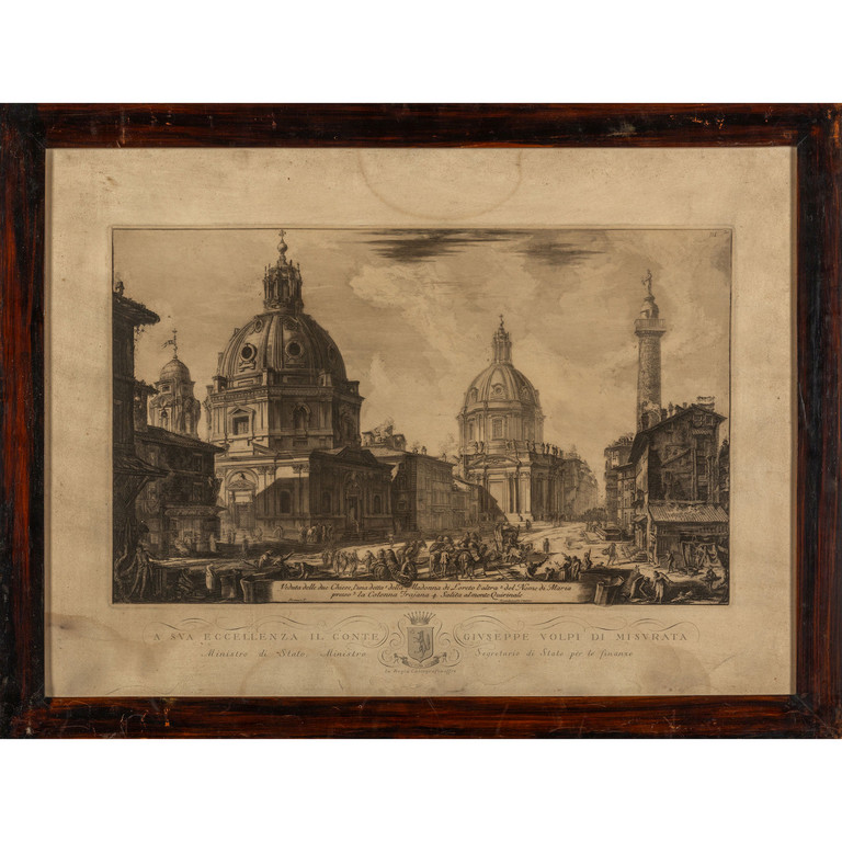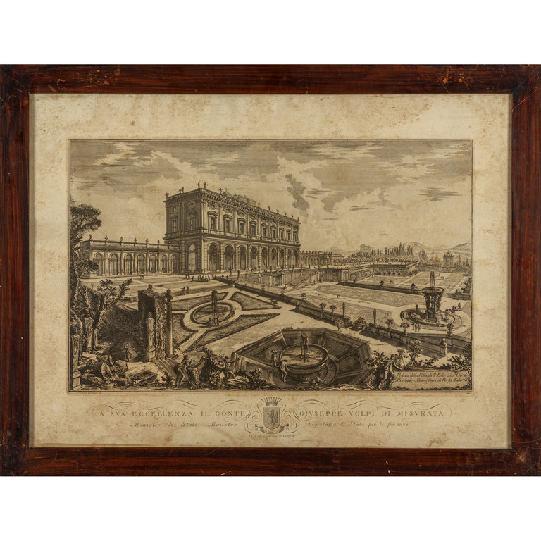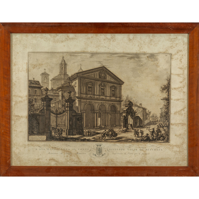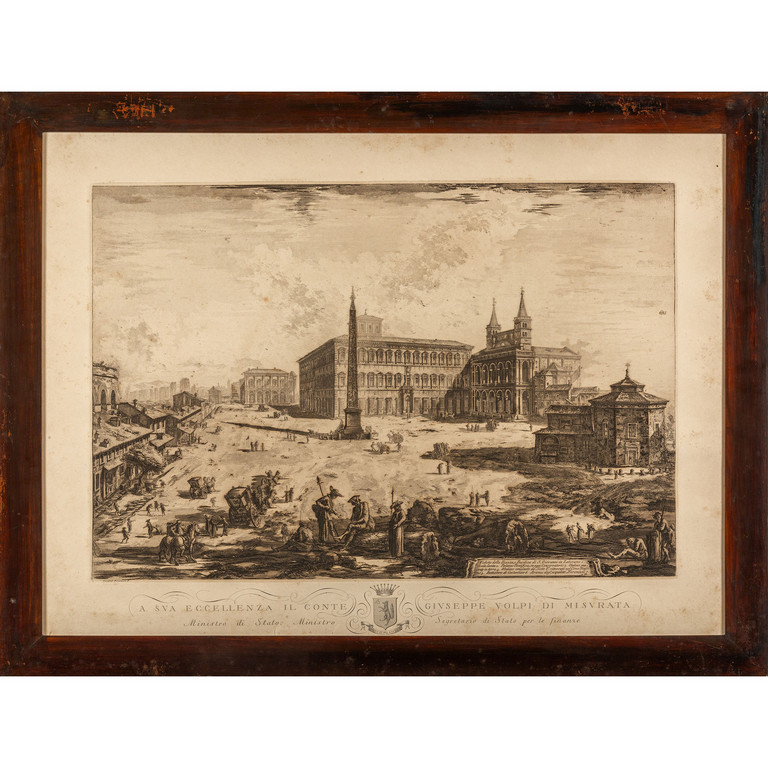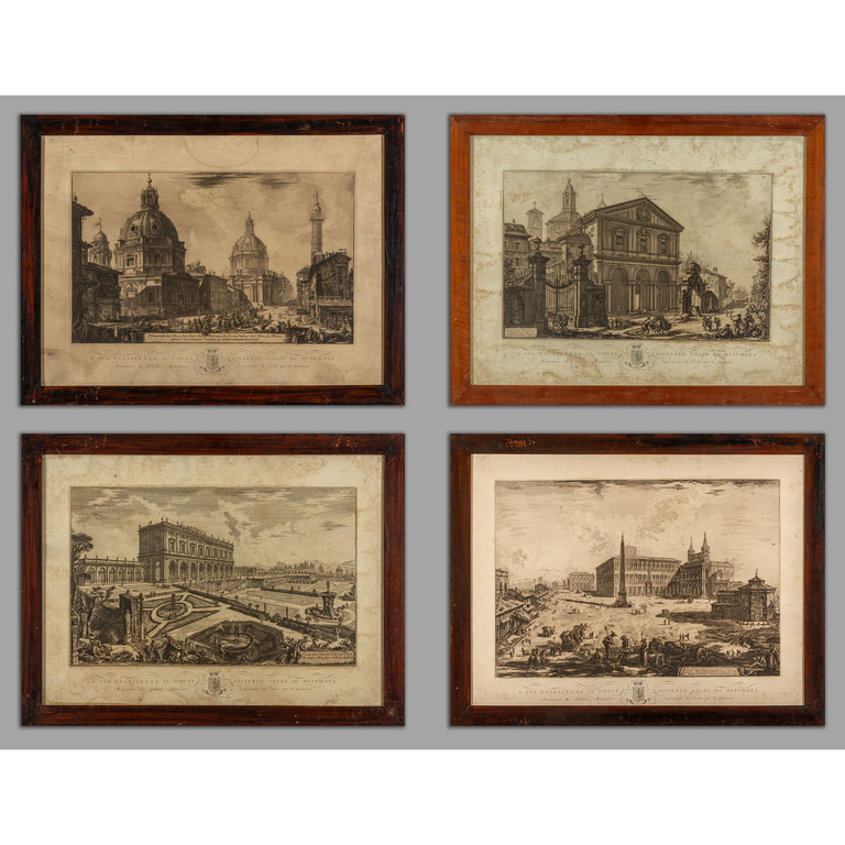 'Veduta della villa di Alessandro Albani' 'Veduta della Piazza e Basilica della Basilica di San Giovanni in Laterano' 'Veduta delle due chiese di Piazza La Colonna Traiana' e 'Veduta della Bisilica di San Sebastiano' 4 stampe da Piranesi eseguite dalla Regia Calegrafia ed offerta a sua Eccellenza il Conte Giuseppe Volpi di Misurata I metà sec.XX