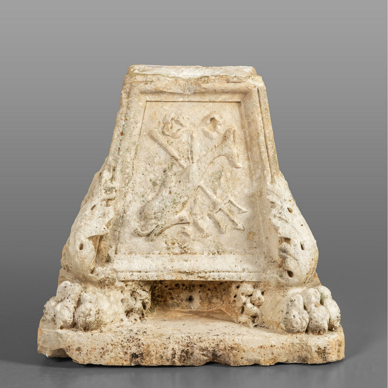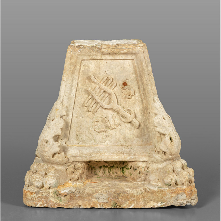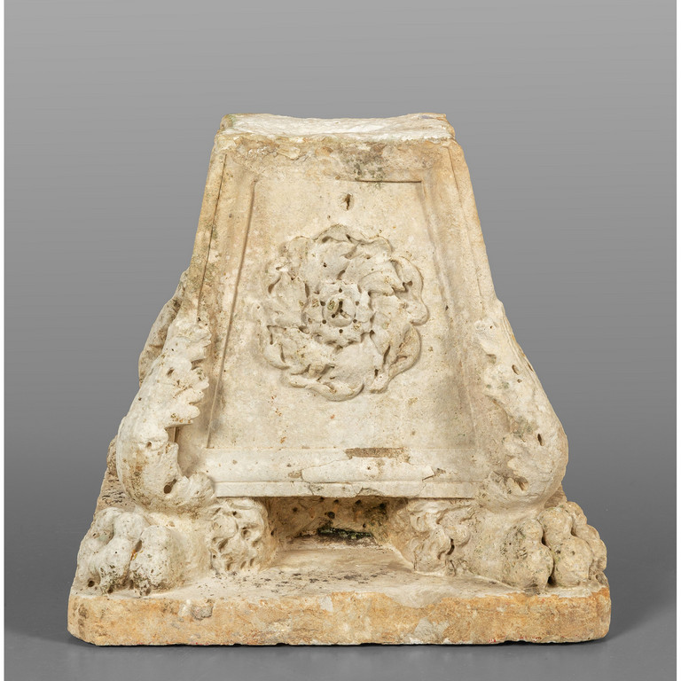 Grande base di torcera in pietra bianca scolpita su tutti i lati con piedi ferini sec. XVI