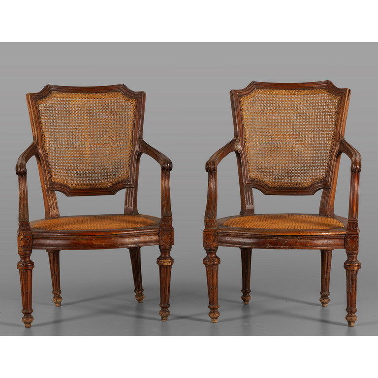 Coppia di poltrone Luigi XVI in noce schienale a scudo con cannè gambe scanalate e controscanalate Genova II metà sec.XVIII