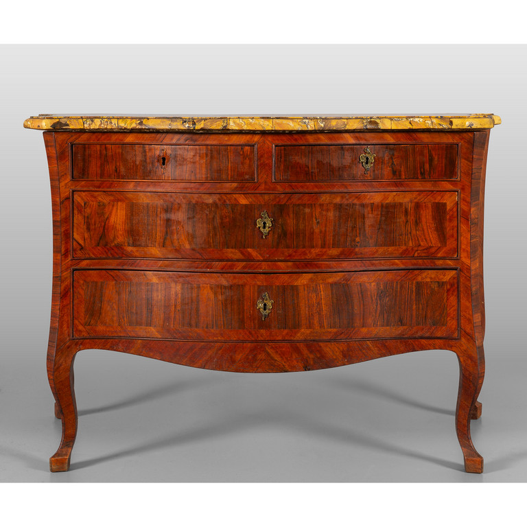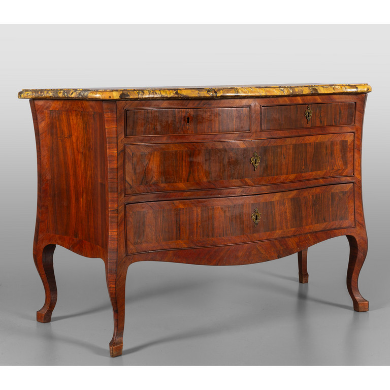 Comò Luigi XIV a balestra a due cassetti più uno lastronato in palissandro piano coevo in breccia Toscana inizi sec.XVIII