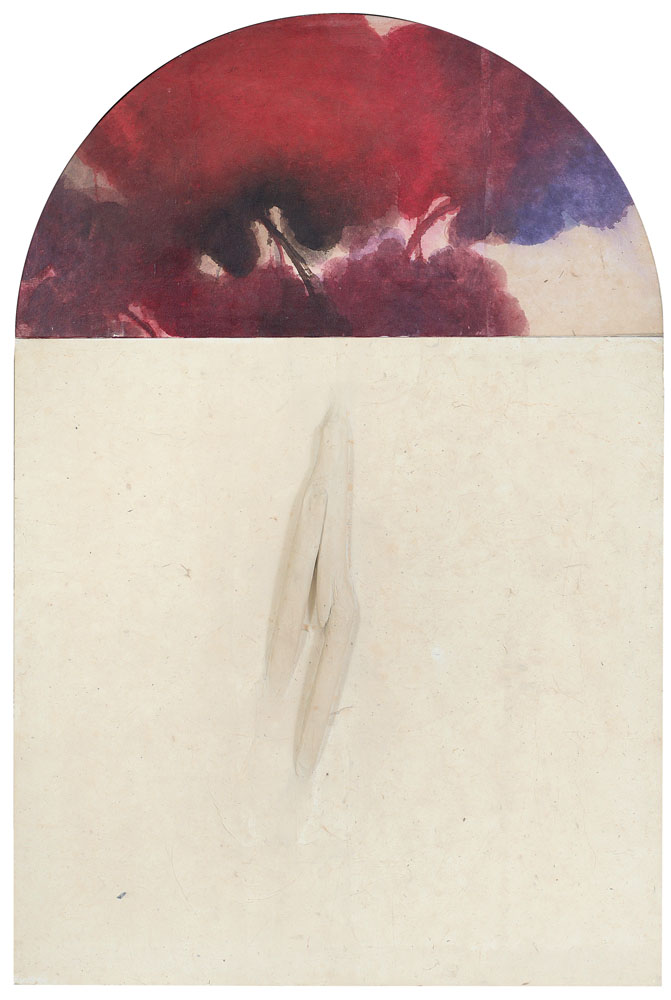 acquerelli e cartapesta su due tele assemblate (la superiore sagomata) cm. 150x100, firma, titolo, anno e tecnica al retro, dichiarazione d'autenticità dell'artista e timbro di Eos Arte contemporanea (MI) su foto, opera priva di cornice.