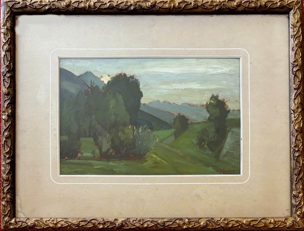 C. Jelmini Italia del Nord XIX secolo, L'argine dell'Adda a Talamona, Valtellina Olio su faesite cm 25,5x36 firmato in basso a dx datato 1955